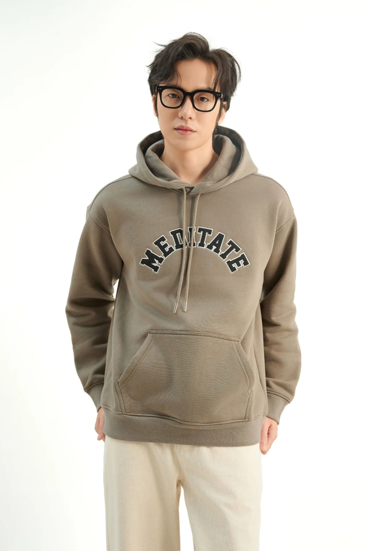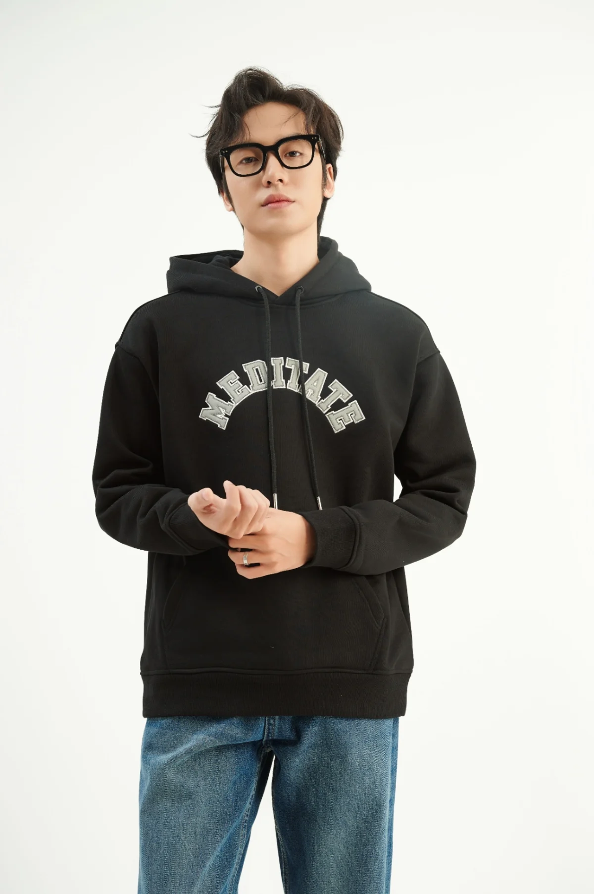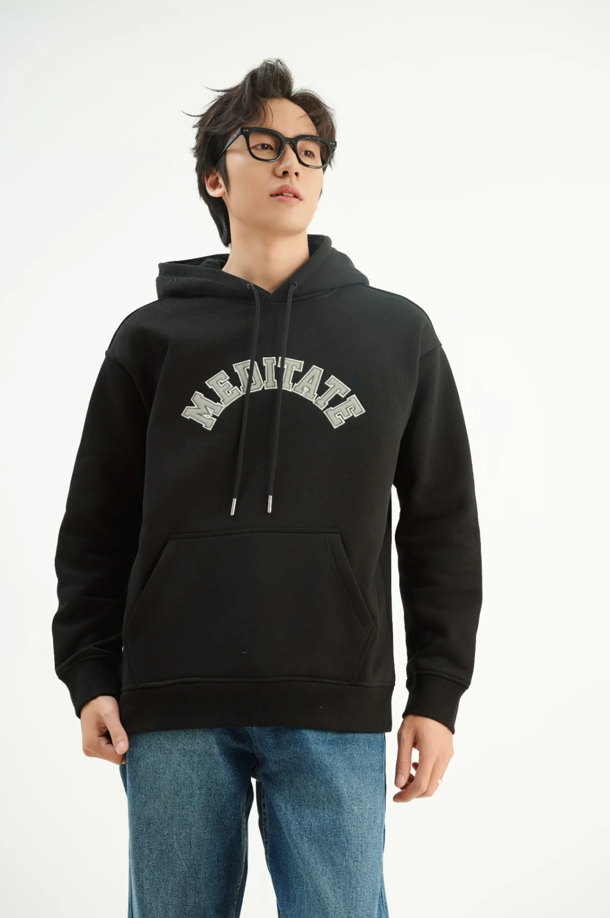►Thiết kế áo hoodie nam cổ tròn với form classic kết hợp hình thêu cong to giữa ngực .